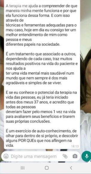 "Você mostrou como é importante refletir sobre o que sou e como reagir diante de uma situação, escutou meus medos e neuroses sem me julgar. Sou muito grato a você Ana. Que continue sendo esta pessoa e profissional maravilhosa."